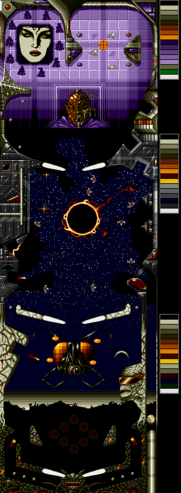 It’s got multiball as well, I worked out some algorithms for that, they wouldn’t have been a problem on the ST but we had a lot more horsepower on PC for sprite collisions, which are surprisingly expensive. The ST version had to have a bunch of tricks to cheapen these to avoid it taking too much frame time. We also used this on another bonus table called ‘The Pool Table’ which let you play multiball-pool with only one ball having gravity on it. Gametek asked us to pull that and turn it into a whole game, but we couldn’t think of enough good ideas to make it work, so the world lost that, bit of a pity.