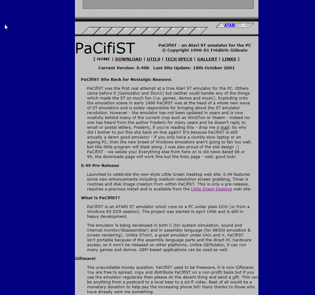 PaCifiST was the first real attempt at a true Atari ST emulator for the PC. Others came before it (Gemulator and StonX) but neither could handle any of the things which made the ST so much fun (i.e. games, demos and music).