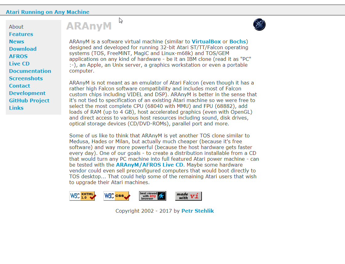 Atari Running on Any Machine: "a virtual machine software for running the Atari ST/TT/Falcon operating systems (TOS, FreeMiNT, MagiC and others) and TOS/GEM applications on any kind of hardware".