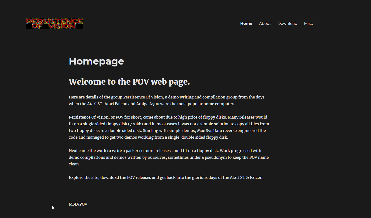 Details of the group Persistence Of Vision, a demo writing and compilation group from the days when the Atari ST, Atari Falcon and Amiga A500 were the most popular home computers.