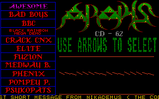 PLEASE FOLKS READ THIS SCROLL !!! A FIRST SHORT MESSAGE FROM NIKADEMUS ( THE CODER ) TO BEGIN . WHEN YOU QUIT A DEMO IT RETURNS TO MY MENU . FOR THE BLACK RAINBOW MEGADEMO IT RETURNS TO THE GEM BECAUSE THE DEMO COMPORTS A FEW SCREENS AND THE SCREENS CANNOT LOAD FROM MY MENU SO WHEN YOU ARE ON THE GEM JUST CLICK ON BLACK.PRG. SO NOW I GIVE THE WRITING TO FRODON HE WANTS TO TELL YOU SOMETHING ABOUT I DON'T KNOW BUT READ IT .......... HELLO AND WELCOME TO OUR NEW MENU ,THE 62 ! ... FIRST OF ALL, I MUST TO TELL YOU THE CREDITS FOR THIS CD ...... THE FIRST PRESENTATION WITH AN 17,02 KHZ SOUNDTRACK CODED BY NIKADEMUS, AND A LOGO DESIGNED BY SPEED DEMON OF THE BIT MASTERS ... THIS GREAT MENU WAS CODED IN ONE HOUR BY NIKADEMUS ( NO RIPPED CODE !!!! ), A MAD MAX ZIK, OF COURSE A LOGO OF SPEED DEMON, LITTLE FONTS BY NIKADEMUS, PACK BY FRODON, GANDALF AND HAGAR DUNOR ( THANKS A LOT ! ) AND FINALLY TEXT BY FRODON ........ I KNOW THAT YOU WANT THE GREETINGS, OK OK NO PROBLEM .... FIRST, A MEGA GREETINGS TO ZUUL ( J'AI LU VOTRE TEXTE CONTRE FUZION, MAD VISION ET REPLICANTS, ET DEPUIS LORS VOUS PASSEZ DANS LA LISTE DE MES GROUPES PREFERES, NOUS SOMMES DE TOUT COEUR AVEC VOUS !!! ) OTHER GREETINGS TO ... THE CONCEPTORS ( DEMON,EXTRA ,ABB, ... ) ... PHENIX ( MR 40,OXYGENE, ... ) ... FARAMIR ... ST KNIGHTS ( DIEU,KELLY X, ... ) ... IMPACT ( AYOROS, ...) ... BIT MASTERS ( SPEED DEMON ) ... ANARCHY ( DRAX, ... ) ... PETER ... HAGAR DUNOR ... ELITE ( ALL MEMBERS ) ... FUZION ( ESSAYEZ D'INNOVER DANS VOS INTROS ) ... PSYKOPATS ( N'HESITEZ PAS A NOUS ENVOYER D'AUTRES ECRANS DE VOUS ) ... THE BLACK CATS ( ALL MEMBERS ) ... TRITON DEVELOPEMENT ( ALL MEMBERS ) ... THE LOST BOYS ( PLEASE, ANOTHER MEGA DEMO !!!) ... INNERCIRCLE ( CFR TLB ) ... NEXT ( LEM,LAP,ZAE,PULSAR,ST WARS,DBUG 2, ... ) ... FUN VISION ( NIC,DAD, ... ) ... JOKER ... KRONOS ... FOXX ... BUSHWAKERS ... MCODER ( GREAT RESET DEMO IN THE TRANS 2 !!! ) ... TCB ( GREAT TCB TRACKER' PACK ) ... REPLICANTS ( ONLY R.AL ) ... POMPEY PIRATES ( GREAT SPARKY'S MUSICS ) ... MEDWAY BOYS ( I'VE PUT YOUR LAST CD IN THIS MENU ) ... DMA ... ... ... ... OK AFTER THOSE GREETINGS ,I WANT TO FUCK THE BIGGEST LAMERS WHO EXIST ... MEGA FUCK TO ZX 81 AND LITTLE GUY FROM BAD BOYS BELGIUM ( NIVEAU MENTAL : 0 , MODESTIE : 0 , CD : 0 , ETC ... ) OTHERS FUCKS TO SPY 3 FROM MAD VISION ( EH ! MON VIEUX, TU CROIS PAS QUE CA COMMENCE A LASSER, HEIN ? NON MAIS FRANCHEMENT, AVEC TES PETITES LETTRES DE MENACES A LA NOIX, MAIS LE PUBLIC A LE DROIT DE SAVOIR, FIGUREZ VOUS QUE, PARCE QUE JE FUCKE ZX 81, SPY 3, VEXE JUSQU'A L'OS, M'ENVOIE DES LETTRES DE MENACES DISANT A PEU PRES CECI : FAIS TES EXCUSES A BAD BOYS SINON TU SERAS DANS LES FUCKS DE MAD VISION ...... HA HA HA HA HA JE ME MARRE !!! MAIS BON SANG, FUCKEZ NOUS, FUCKEZ NOUS, C'EST PAS UN PETIT GROUPE COMME VOUS QUI ALLEZ ME FAIRE PEUR, HEIN ? SPY 3, COMPLEXE JUSQU'AUX OREILLES, TU VOULAIS UNE RAISON POUR LAQUELLE JE FUCKAIS BBB, C'EST SIMPLE, SI J'OUBLIE QU'ILS VENDENT DES SOFTS CRACKES A UN PRIX DEGEULASSE, QU'ILS PAYENT AVEC L'ARGENT RECOLTE DES CODEURS POUR QU'ILS LEUR FASSENT DES INTROS, ALORS TU DOIS CONNAITRES LA DERNIERE IDEE (!) DE ZX 81 : VOUS QUI ETES DERRIERE VOTRE MONITEUR, LISEZ BIEN LA SUITE ... TOUT LE MONDE CONNAIS 'TRB' ET LEUR 'ALF MEGA DEMO', VOUS ETES BIEN EVIDEMMENT AU COURANT QUE LEM ( DE NEXT ) ET NIC ( DE FUN VISION ) PREPARENT LEUR 'ALF MEGA DEMO 2', FIGUREZ VOUS QUE ZX 81 A REALISE EN GFA, SA PROPRE LAMENTABLE FAUSSE VERSION DE CETTE FUTURE SUPER PRODUCTION EN UTILISANT NOS NOMS, ET BIENSUR, IL LA DIFFUSE !!! ) FUCK TOO, TO MAXI FROM THE REPLICANTS ( ALORS PETIT, Y PARAIT QUE TU NOUS FUCKE AUSSI ( DECIDEMENT ,ILS SE SONT PASSER LE MOT OU QUOI ? ), ACHETE 'PAPERBOY' ET TAIS TOI, OK ? Y A BELLE LURETTE QUE TU NE FAIT PLUS PEUR A PERSONNE ) FUCK TO, SCOR INFORMATIQUE ( Y A 3 ANS, LORSQUE JE N'ETAIS QU'UN PETIT LAMER ( UNE REFLEXION DE TRAVERS ET VOUS ETES MORT ), IL ( MARC DE SCOR ) M'AVAIS VENDU LA 'PREVIEW' DE 'BLOOD MONEY' POUR 400 FB EN TEMPS QUE JEU DEFINITIF !!! OU AUTRE CHOSE, SPACE ACE EN PIRATE COUTAIT 900 FB !!!!!!!!! ETC ) FUCK TO PLETINX ( AUSSI LAMENTABLE QUE SCOR, BAD BOYS, STARSOFT ET EMC CLUB ) ........ WELL ,I MUST TO PRESENT YOU THE THREE MEMBERS OF ARAKIS ( AND NOT ARKIS, N'EST CE PAS AYOROS ), BON ,OH NO ,WELL THEY ARE : NIKADEMUS ( CODER ) FRODON ( CONTACTS ANS SOME GFX ) AND GANDALF ( CD PURVOYER AND SPREADER ) ...... OK NOW SOME GREETINGS TO MY BEST GROUP ( MUSICAL SONG ) : INDOCHINE , DEPECHE MODE ( THEY HAVE AN ST ! ) , SIMPLE MINDS ( FAVOURITE GROUP OF JOKER ) , THE DOORS , R.E.M. , K.L.F. , FREDERIKS GOLDMAN AND JONES , U2 , FRONT 242 , TELEPHONE , ... FUCK TO : DIDIER BARBELIVIEN , ELSA , SANDRA KIM , ... OK BOY, NOW IT IS 10:00 (PM) AND THERE IS MAYBE A MOVIE ON MY T.V., WHO KNOWS ? SO, A LAST THING ABOUT OUR CD, SORRY IF THERE AREN'T MUCH SCREENS, BUT : FUZION TAKES 100 K, BLACK RAINBOW TAKES 200 K, AWESOME TAKES 100 K TOO, THEN YOU SEE ........ BYE BYE FOLKS AND LET'S WRAAAAAAAAAP THE TEXT .......