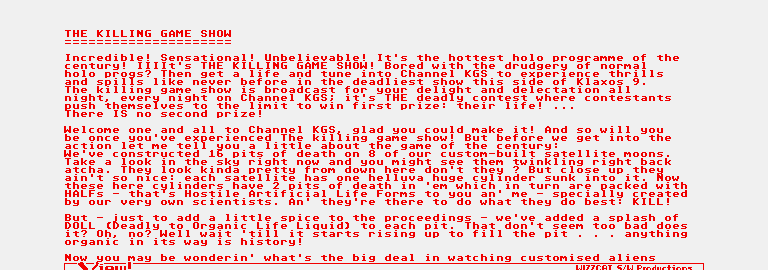 WELCOME TO BBC DISK 42. I -LAW- THINK THIS LOOKS CRAP, BUT THE OTHERS ASSEMBLED HERE -FLAVE HQ- THINK IT IS OK. ANYWAY, IT WAS CODED BY ANDY, WITH GRAPHICS BY A BACKWARD DUREX AND MUSIC BY THE HIPPEL. AS WITH DISK 35, I AM AWAKE WHILE THE OTHERS SLEEP. SHALL I GO AND THROW SOME COLD -AND I MEAN THAT- WATER OVER THEM? NA... ANDY IS GIVING ME A LIFT HOME LATER... -I HOPE- I BET HE HAS USED THAT CRAPPY AMIGA FONT ON THIS DISK. HE LIKES THAT FONT. WHAT HAVE WE GOT THIS TIME FOR YOU?? ON THIS DISK IS... THE KILLING GAME SHOW -PSYGNOSIS- NAVY SEALS -OCEAN I THINK- AND ONE FROM MY ALL TIME FAVE SOFTWARE HOUSE, THE COMPANY WITH THE BEST ARTISTS, MUSICIANS, AND CODERS, YES, IT IS A GAME FROM NONE OTHER THAN........... -IS THIS A BUILD UP OR WHAT?- YOU CAN'T WAIT..... NONE OTHER THAN..... VULTURE! -GROAN- AND IT IS CALLED....... MERCHANT COLONY.... AND IT IS CRAP.... ALSO RELEASED ON THIS GLORIOUS MORNING OF THE 9TH OF APRIL, 1991, IS BBC 43 WHICH CONTAINS 'MASTERBLAZER' AND 'WARLOCK... THE AVENGER' -AND A CRAP 3K MENU. THE DISK HAS ZERO CLUSTERS FREE!- SO WATCH OUT FOR THAT COMING YOUR WAY WHEN WE BOTHER TO POST IT. DID YOU KNOW THAT MOST LAW MENUS ARE READY FOR OVER A WEEK BEFORE ANYONE WILL SEE THEM? THE REASON IS SIMPLE. I AM TOO SMEGGING LAZY TO GO DOWN THE POST OFFICE! THEY DO A GREAT JOB, THE POST OFFICE. JUST THE OTHER DAY ANDY GOT A LETTER WITH... ANDY, -STREET NAME DELETED- WRITTEN ON IT. HOW MANY -STREET NAME DELETED- ARE THERE IN THE UK? IS THAT COOL OR WHAT? I HAVE HAD SOME GOOD THINGS LIKE THAT AS WELL, BUT NOT RECENTLY COS I GAVE THE PERSON RESPONSIBLE A GOOD BOLLOCKING. FLAVE IS -STILL- WATERING THE PLANTS. HE WAS DOING THAT LAST TIME I WAS HERE AND I THINK HE IS TRYING TO KILL THEM ALL OFF. ONLY THE OTHER DAY HE SAID.... 'I'M GOING TO KILL THE BLOODY THINGS OFF AND GET PLASTIC ONES.' WE WENT TO THE VIDEO SHOP YESTERDAY AND GOT A FILM BECAUSE XERUD SAID IT WAS GOOD. WELL, IT CERTAINLY WASN'T! HOW COULD WE LET THE TASTE OF A MAN WHO CAN'T UNDERSTAND 'HIGHLANDER' DECIDE WHAT WE WATCH? THE FACT IS THAT ANDY AND MYSELF WERE NOT THERE WHEN FLAVE AND XERUD HIRED IT. BUT LAST NIGHT WAS SAVED BY ANDY'S COPY OF WRESTLEMANIA VII WHICH WAS BRILLIANT. I THINK THE FOLDING CHAIR WON MOST OF THE FIGHTS. WHAT DO YOU THINK ANDY? 'ZZZZZZZZZZZZZZ' OH, HOW ABOUT YOU THEN, XERUD? 'ZZZZZZZZZZZZZZ' LAZY BUGGERS! HANG ON WHILE I GO AND WAKE THEM UP. 'YEAH, YEAH, I'M UP' WAS THAT A SIGN OF LIFE OR AN AUTOMATED RESPONSE TO IMMINENT MOBILITY? XERUD WAS A BIT QUIET. MAYBE HE DIED. HAVE WE GOT ANY CRAPPY GLOWING GREEN GUNGE -FROM THE 'FILM' WE WATCHED- THAT WE CAN INJECT INTO HIS NECK. I KNOW ALL THE DEAD PEOPLE CAME BACK DERANGED, BUT NO-ONE WILL NOTICE WITH HIM. HAVE YOU SEEN THE BBC MEGADEMO YET? I DOUBT IT, BUT IT IS LOOKING WELL HORNY SO FAR. I COULD TALK ABOUT THAT BUT IT WOULD ONLY SPOIL IT FOR YOU FOR WHEN WE DO ACTUALLY RELEASE IT. MY GOD. MOVEMENT FROM BEHIND ME. IT'S XERUD! HE MOVES! THE GLOWING GUNGE WORKED! NOW WHERE IS ANDY. YES, I THINK I HEARD HIM. HOLD ON. IT COULD HAVE BEEN A FALSE ALARM. A FEW MINUTES WENT PAST QUICKLY. THEY DIDN'T WANT TO HANG AROUND -T. PRATCHETT- WHERE IS THE -1 KEY, THIS TEXT IS TERMINATED AS OF NOW!