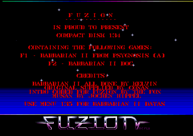 YO FANS !! FUZION PRESENTS YOU COMPACT DISK 133 WICH CONTAINS : OBITUS DATAS ( PART B FOR MENU 132 ), BUG BASH ( CRACKED BY CAMEO FROM THE REPLICANTS ), AND BLACK JACK PLUS 3 ( SUPPLIED BY YOGI OF FORCE 69, PACKED BY ORION FROM FUZION ). THANX TO OUR GERMAN FRIEND THE FOX FOR DIS LITTLE INTRO. FUZION MEMBERS ARE : ORION ( CODER AND CRACKER ), DRAGON ( SUPPLY, SWAP AND CD ), KELVIN ( CRACKER ), 1772 ( CRACKER ), KASAR ( CODER ), KELLY.X ( CODER ), ETERNAL ( RTEL SWAPPER ), INFIRMIER ( RTEL SWAPPER ), SQUAT ( GRAPHIX ), MACDOS ( GRAPHIX ), FULCRUM ( SWAPPER ), DUMP ( MUSAX ), ALAN PARKER ( MUSAX ) AND SHIRYU ( SWAPPER ). TO GET IN TOUCH WITH US WRITE TO : - FUZION - BP 66 59420 MOUVAUX FRANCE WRAP TIME ......