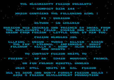 YO FANS !!!! HERE WE GO AGAIN ... THE LEADING BEST FRENCH CD CREW FUZION BRINGS YOU : COMPACT DISK 148 WICH CONTAINS : GODFATHER : DISK 2 THIS GAME WAS CRACKED BY ICS AND PACKED BY ORION FROM FUZION, WE REMIND YOU IT IS NOW IN 3 DISKS INSTEAD OF 6 CREDITS: 68000 CODE BY KASAR, SOUNDTRACK ROUTS BY WIZZCAT AND IMPROVED BY KASAR, OLD PICTURE BY SQUAT, MODULE RIPPED FROM 'OUTRUN EUROPA' ON THE AMIGA ! IF YOU HAVE A STE, CONNECT YOUR COMPUTER TO A HIFI. IF YOU HAVE A STF AND A CARTRIDGE TRY THE FOLLOWING KEYS : F8 ( SOUNDCHIP ), F9 ( REPLAY ) AND F10 ( MV-16 ). FUZION MEMBERS ARE : - KELVIN - ( CRACKER - FILER - PACKER - CODER ) - BVCA - ( CRACKER - FILER - PACKER - ) - ORION - ( CRACKER - FILER - PACKER - CODER ) - TURBO - ( CRACKER - FILER - PACKER ) - THE FOX - ( CRACKER - CODER ) - ELLFIRE - ( SUPPLY - SWAP - CD ) - MACDOS - ( GRAPHIST - SWAP ) - KASAR - ( CODER ) - KELLY.X - ( CODER ) - ALAN PARKER - ( MUSICIAN ) - FULCRUM - ( SWAPPER ) - ST FOREVER - ( SWAP AND SUPPLY ) - INFIRMIER - ( SWAPPER ) - SQUAT - ( GRAPHIST ) - DUMP - ( MUSICIAN ) - SHIRYU - ( SWAPPER ) IF YOU WANT TO JOIGN US WE'RE LOOKING FOR ORIGINALS SUPPLIERS AND ALSO FOR MODEM TRADERS ! DON'T MISS YOUR CHANCE, WRITE TO : - FUZION - BP 66 59420 MOUVAUX FRANCE I REPEAT : - FUZION - BP 66 59420 MOUVAUX FRANCE WE SEND OUR BEST REGARDS TO ALL OUR REAL FRIENDS AND CONTACTS SINCE THE BEGINNING, THEY KNOW WHO THEY ARE, AND NOT TO THE PEOPLE WHO LICK UP OUR ASS NOW .... LET'S RULE, LET'S WRAP .... ELLFIRE SIGNING OFF