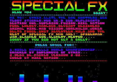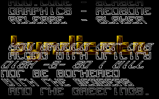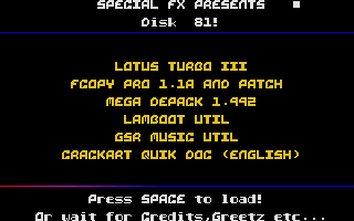 ADRENALIN PROUDLY PRESENT COMPACT DISK TWENTY SEVEN. RELEASE DATE 16-10-92 COPY THIS DISK 82 TRACKS 10 SECTORS 2 SIDES ON THIS DISK IS LOTUS III CRACKED BY CYNIX (THANKS FOR SENDING IT QUATTRO), MYSTIC WELL UNLIKE OUR OLD VERSION OF THIS GAME YOU CAN NOW SAVE YOUR GAME, MEGA DEPACKER 2 PROBABLY THE BEST DEPACKER EVER WRITTEN AND A GREAT LITTLE GAME CALLED BALLS. CREDITS FOR THIS DISK AS FOLLOWS.... MENU CODED BY SPACEMAN SPIFF, GRAFIX BY DOD MUSIC BY CRAWDADDY AND DISK COMPILED BY MOOKIE. I HAVE BORROWED A HALF MEG ST, SO ANY FUTURE MENUS DONE BY ME WILL BE TESTED SO THAT YOU HALF MEG OWNERS DO NOT THINK YOU'VE GOT A BAD COPY OF ONE OF OUR CD'S JUST 'COS A GAME DIDN'T WORK. MESSAGE TO T.B.A. MEMBERS. I HAVE RECEIVED A LETTER FROM JAM OF SPECIAL FX AND HE CLAIMS ALTHOUGH ASKED TO JOIN THE T.B.A. HE DID NOT SEND A REPLY. I REGRET TO INFORM OTHER T.B.A. MEMBERS THAT SPECIAL FX ARE NOT MEMBERS OF THE T.B.A. AS THEY HAVE TAKEN A VOTE AND THE MAJORITY OF MEMBERS DID NOT WANT TO JOIN. SO CONTINUE TO GREET SPECIAL FX BUT REMOVE THEM FROM THE T.B.A. MEMBERS LIST. ARE THERE ANY PEOPLE OUT THERE READING THIS SCROLLER WHO ATTEND ST COMPUTER CLUBS?? WELL, IF SO GET IN TOUCH 'COS I'VE HAD A GOOD IDEA (MAKES A CHANGE) I'VE HAD PEOPLE AT OLDHAM COMPUTER MOAN THAT SOFTWARE IS NOT GETTING TO THEM FROM THE TOP GUYS THESE DAYS, AND I THOUGHT WELL WHY DON'T YOU WRITE TO OTHER COMPUTER CLUBS AND SWAP SOFTWARE THROUGH THE POST. I MEAN CYNIX SEEM TO OPERATE IN SCOTLAND, SO I GUESS THE SCOTTISH CLUBS GET LOTS OF NEW STUFF QUICKLY, WHERE WE HAVE TO WAIT FOR IT TO TRAVEL DOWN OR UP THE COUNTRY. WHY NOT MAKE A NETWORK OF COMPUTER CLUBS THROUGHOUT BRITAIN AND THEN YOU GUYS COULD BE GETTING HOLD OF THE LATEST CRACKS, DEMOS, PD, UTILITIES ETC. IF YOU THINK THIS IS A GOOD IDEA THEN WRITE TO US WITH THENAME OF YOUR COMPUTER CLUB AND ADDRESS PLUS YOUR OWN NAME AND ADDRESS AND WE'LL GET A LIST OF NAMES AND ADDRESSES AND SEND THEM OUT TO ALL THE COMPUTER CLUBS WHO REPLY. THIS WILL THEN MEAN YOU CAN SEND SOFTWARE LISTS TO EACH OTHER ETC. DON'T EXPECT ADRENALIN TO DO ALL THE WORK!! IF YOU WANT YOURCLUB TO GET HOLD OF NEW STUFF ETC. YOU'RE GONNA HAVE TO GET OFF YOUR FAT ARSES AND DO SOMETHING!! OF COURSE WE WILL SUPPLY YOU WITH THE LATEST ADR MENUS, SO IF YOU'RE INTERESTED SEND YOUR DETAILS TO.... MOOKIE, C/O ROB.D, 53 CHURCH RD, CLACTON ON SEA, ESSEX, ENGLAND. THAT WAS.... MOOKIE, C/O ROB.D, 53 CHURCH RD, CLACTON ON SEA, ESSEX, ENGLAND. I SHALL START BUILDING UP A LIST IN THE FOLLOWING MONTHS PLEASE SEND AN S.A.E. IF YOU WISH TO RECEIVE THE LIST OF COMPUTER CLUBS ETC. RIGHT, LET'S DO THE GREETINGS. GREETINGS TO THE REST OF THE BRITISH ALLIANCE WHO ARE... C.I.D., INSANITY, OUT OF ORDER (ESP. SONIC AND THE ASSASSIN), SYNCRO SYSTEMS, THE LEMMINGS AND WILD! (ESP. SNAZ) GREETINGS ALSO TO THE FOLLOWING... ANIMAL MINE, ADMIRABLES, ANTHRAX, BREAKPOINT SOFTWARE, CHAOS (ESP. BEN), CYNIX (ESP. QUATTRO AND SUPERNOVA), CRACKDOWN (ESP. INSPIRAL), CHRIS H (YORK), CHRIS H (MID GLAM), CHRIS H (STAFFS), D-BUG, DIGI TALLIS, ELITE (ESP. SIDEWINDER OF HOTLINE, SEND SOME STUFF SOON), THE EDGE, (E) TRIPPER, FUZION, INDIE HEAD (ESP. THE CHARLATAN), KGB, MAD VISION, MUG U.K., MICRO MANIAC, PERSISTENCE OF VISION (ESP. MAC SYS DATA AND BORIS), POMPEY PIRATES, POWA, PULSION, PURE ENERGY, REPLICANTS, RIPPED OFF (ESP. STICK AND BILBO), RED LICHTIE, SPECIAL FX (ESP. JAM), SYNDICATE, SUPERIOR, SAFARI (ESP. PANTHER AND RHINO), SCANZ, TIM, UNTOUCHABLES (ESP. MAT) AND XENOCIDE. WELL, WHAT USUALLY COMES AFTER MY GREETINGS LIST?? YOU'VE GOT IT. LET'S WRAP !!!