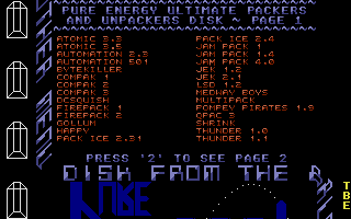 WELCOME TO ANOTHER MENU DISK FROM THE BALD EAGLE!!!! THIS TIME IT IS THE ULTIMATE PACKERS AND UNPACKERS DISK. PRESS THE SPACEBAR TO QUIT TO THE DESKTOP TO GET AT THESE GOODIES. GREETZ AS USUAL GO TO ALL THOSE THAT KNOW ME OR KNOW ANY OTHER MEMBER OF PURE ENERGY.