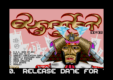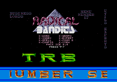 THE EVIL FORCE PROUDLY PRESENT EVIL DISK NUMBER 4 I AM IN THE MIDDLE OF ONE OF THOSE STAY UP ALL NIGHT AND HACK KINDA THINGS AGAIN, SO EXPECT QUITE A SCROLLER THIS TIME! DURING THIS SCROLL I WILL TALK ABOUT MANY DIFFERENT THINGS! THERE WONT BE A GREET LIST ON THIS ONE, AS THE LAST MENU HAD A VERY EXTENSIVE ONE!!! ANYWAY, FIRST ON THE LIST IS THE GREAT GAME ON THIS MENU WHICH IS CALLED MIDNIGHT RESISTANCE! THIS HAS GOT TO BE ONE OF THE MOST AMAZING GAMES I HAVE SEEN IN A LONG TIME! ITS ANOTHER ONE OF THOSE MINDLESS SHOOTEM UPS, BUT I REALLY LIKE THE GRAPHICS ON IT! DO YOU? ANYWAY, LETS TALK ABOUT THE ACTUAL MENU STATUS. I AM IN THE PROCESS OF ADDING AN EQUALIZER, OR PERHAPS AN UPPER BORDER SCROLL AS WELL. I HAVE THE SOURCE TO READ THE VOLUME, AND AM JUST WORKING ON GETTING IT TO WORK PROPERLY WITH OUR MENU. EXPECT TO SEE IT IN THE NEXT FEW DISKS, PERHAPS... TCC IS ON VACATION RIGHT NOW, SO ITS JUST ME AND M.O. FOR A WEEK OR TWO. AFTER THAT, I AM GOING ON VACATION FOR A MONTH, BUT TCC AND MO CAN SURELY KEEP THE DISKS FLOWING, I HAVE CONFIDENCE IN THEM... MY MEGA HERE THAT I AM USING TO WRITE THIS MENU IS ON THE BLINK AGAIN? IT ONLY BOOTS UP ONCE IN A WHILE, BUT AT LEAST ONCE YOU HAVE IT GOING, IT STAYS GOING AS LONG AS ITS ON.. OOPS SORRY ABOUT THAT!!! BACK TO NORMAL AGAIN... JUST SHOWS YOU HOW VERSATILE OUR MENU IS!! ALRIGHT, SO DO YOU HAVE ANYTHING TO SAY TO ME RIGHT NOW??? NO!? OH ALRIGHT ILL LET YOU HOLD YOUR PEACE FOR A WHILE LONGER I SUPPOSE. I REALLY LIKE THE NEW HOTLINE INTRO WITH THE BIG BOUNCING LOGO ON THE TOP! I WILL HAVE TO DESIGN SOMETHING SIMILAR TO THAT MYSELF FOR OUR MENUS IN THE FUTURE WHEN I GET A LITTLE BETTER AT CODING, ALTHOUGH WE ARE OFF TO A GREAT START ALREADY! ON THIS DISK YOU WILL FIND A WHOLE PILE OF UTILITIES AS WELL! MANY PACKERS FROM THE VARIOUS GROUPS HAVE BEEN INCLUDED ON THE DISK, AND I HOPE YOU FIND THEM OF USE! THE REASON FOR DOING THIS IS THAT THERE WERENT ANY OTHER QUALITY GAMES AT THE TIME, AND WE DIDNT WANT TO WAIT FOR PUTTING OUT THIS MENU AND KEEP YOU WAITING NOW WOULD WE? MAYBE I COULD USE OUR LITTLE BAND UP THERE IN THE PICTURE AS AN EQUALIZER SOMEDAY HAHAAHAAA THAT WOULD LOOK PRETTY COOL WOULDNT IT! OH YES, WHILE I AM AWAY A FRIEND WILL BE LEAVING HIS HD HERE FOR MY BBS TO USE, SO THERE WILL BE HUNDRED NINETY FIVE MEGS ONLINE AT THE AARDVARK! BE SURE TO GIVE IT A CALL CHECK THE OTHER MENUS FOR THE NUMBER IF YOU DONT HAVE IT ALREADY... HAS EVERYONE HEARD ABOUT CRS GOING DOWN YET? THE NINETY FIVE LINE, SIX GIGABYTE SYSTEM IS GOING DOWN IN JUST 7 DAYS! OH WELL, WHAT CAN YOU DO... THEY ARE SELLING ALL THEIR EQUIPMENT INCLUDING THE 100 IBMS FOR 100000 BUCKS CANADIAN! ANY BUYERS OUT THERE. HEH ANYWAY, I THOUGHT THIS WOULD BE A REALLY LONG SCROLL, BUT THINGS ARENT WORKING OUT THAT WAY. I UNFORTUNATELY WILL HAVE TO LET YOU GO, SO UNTIL NEXT TIME, TAKE CARE TIME TO WRAP ....................................