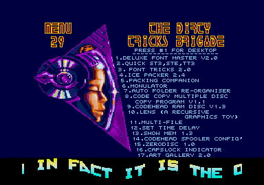 HI AND WELCOME TO THE DIRTY TRICKS BRIGADE MENU DISC 29. COMPILED BY O.B.WAN, LOADS MORE MEGA TITLES FOR YOU ON THIS MENU. THERE IS A MONO EMULATOR FOR THE DELUXE FONT MASTER, AND THERE IS ALSO THE PACKING COMPANION FOR THE USE OF ALL YOU PACKERS, SO I HAVE ALSO INCLUDED ICE PACKER 2.4 AND LOTS MORE. NOW FOR SOME SERIOUS POINTS ....... THE LATE AND VERY NEARLY DEAD F.C.C. KEEP SPREADING FALSE RUMOURS THAT WE PINCH SOFTWARE FROM THEM WHEN IN FACT IT IS THE OTHER WAY AROUND. WE KNOW FOR A FACT THAT THEY DID NOT HAVE PAGESTREAM 2 AND PROTEXT 5.0 UNTIL WE SENT THEM TO FAT ALEC. ELRIC ONE OF OUR MAIN SUPPLIERS USED TO BE IN THIER GROUP BUT WAS RIPPED OFF BY VARIOUS MEMBERS OF THE GROUP OF ABOUT 50 OR SO DISCS SO HE CAN VERIFY JUST WHAT THEY ARE REALLY LIKE. SO COME ON MONSTER IF YOU ARE GOING TO SPLIT FROM THE GROUP LIKE YOU SAY THEN TELL THE TRUTH ABOUT THEM BUNCH OF LAMERS . YET ANOTHER PRIZE WANK-STAIN IS MOB FROM AUTOMATION, NOT ONLY DID HE RIP OFF ELRIC OF 80 QUID BUT IF YOU WANT TO KNOW WHAT , MOB - MARK O BRIEN - , IS REALLY LIKE THEN READ THE RADICAL BANDITS MENU 19. COME ON AUTOMATION WHY HAS A GOOD GROUP LIKE YOURS LET A BEAST LIKE MOB INTO YOUR GROUP, GET RID OF THE SCUM-BAG . THE PICTURE YOU ARE LOOKING AT WAS RIPPED FROM EXTASE BY O.B.WAN MEMBERS OF THE DIRTY TRICKS BRIGADE ARE :- O.B.WAN THUNDERCHILD THE MIGHTY APOLLO INSPECTOR GADGET MEGA GREETS GOTO THE REST OF THE D.T.B. ELRIC- MEGA SUPPLIER AND CONTACT- KEEP UP THE GOOD WORK TEDDYSTACKER AND WACKY JACKY - NICE RELEASES NORMAL GREETS GOTO THE NECROMANCERS ESP IAN OF STX SASH ESP THE NECROMANCER ANGELS OF MERCY ESP SARAH,JESSICA AND KIM MEDWAY BOYS ESP GINO NOW 5 ESP SKIPPY JIMMY-DREAM WORRIOR GESZ AND ALAN B. BEN BBC POMPEY PIRATES DREAMWEAVERS AUTOMATION JAY R. EGOTRIPPERS FOF FOFT G - FORCE THE INTRUDER AWESOME ESP RUTHLESS - NICE MENUS - THE RADICAL BANDITS AND ANY OTHER GROUPS WORTH A MENTION , THEN MENTION US ...... BYE .................................WRAP.................