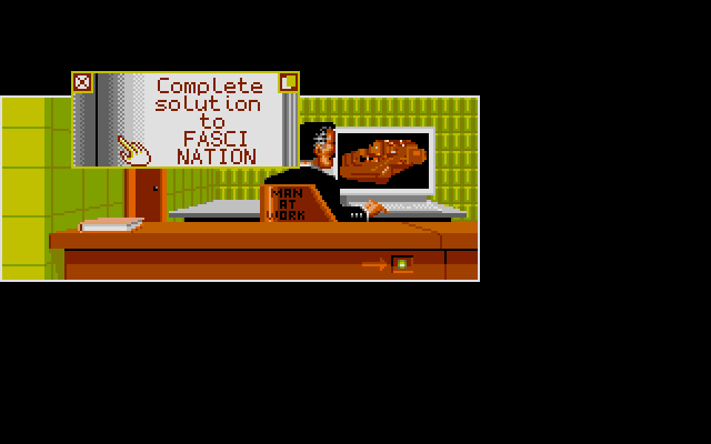 Fascination is a simple adventure game. The puzzles are most of the time pretty straight forward. Also the fact that most of them need to be solved in the same screen, and that it is sometimes impossible to even leave the scene before a puzzle is solved, helps a lot. You don’t need to drag objects with you to solve a puzzle later on in the game. Well, apart from 1 or 2 cases. For example, in the first scene you need to find the vial containing the dangerous substance hidden in the briefcase. The first thing to do is retrieve the lock combination to open the case. Once this is done you find a hairdryer. The hairdryer needs to be plugged into the socket of the hotel room, but it doesn’t fit. You can find a converter in the drawer. Now you are able to connect the hairdryer, turn it on and the vial is yours. There is more stuff to do, but all of this happens on the first screen and you can not leave and continue the adventure until it is all uncovered.